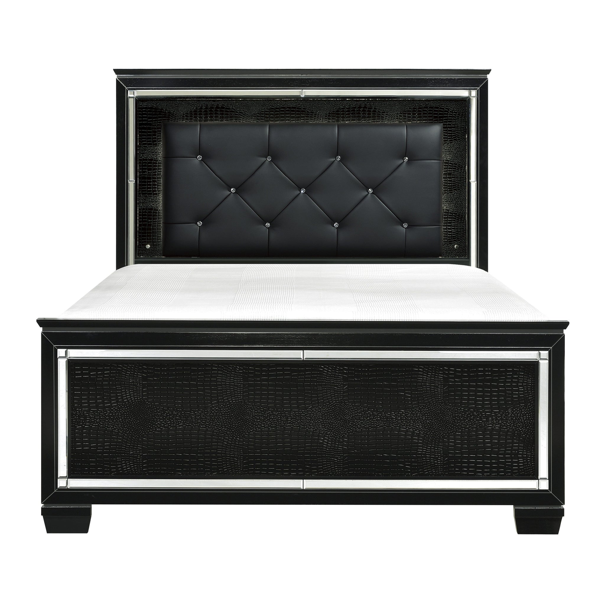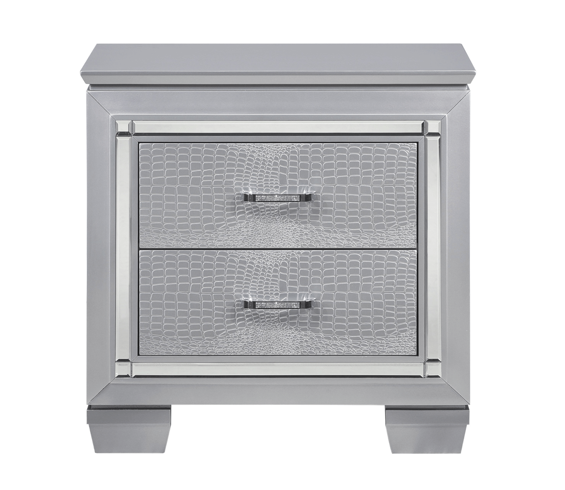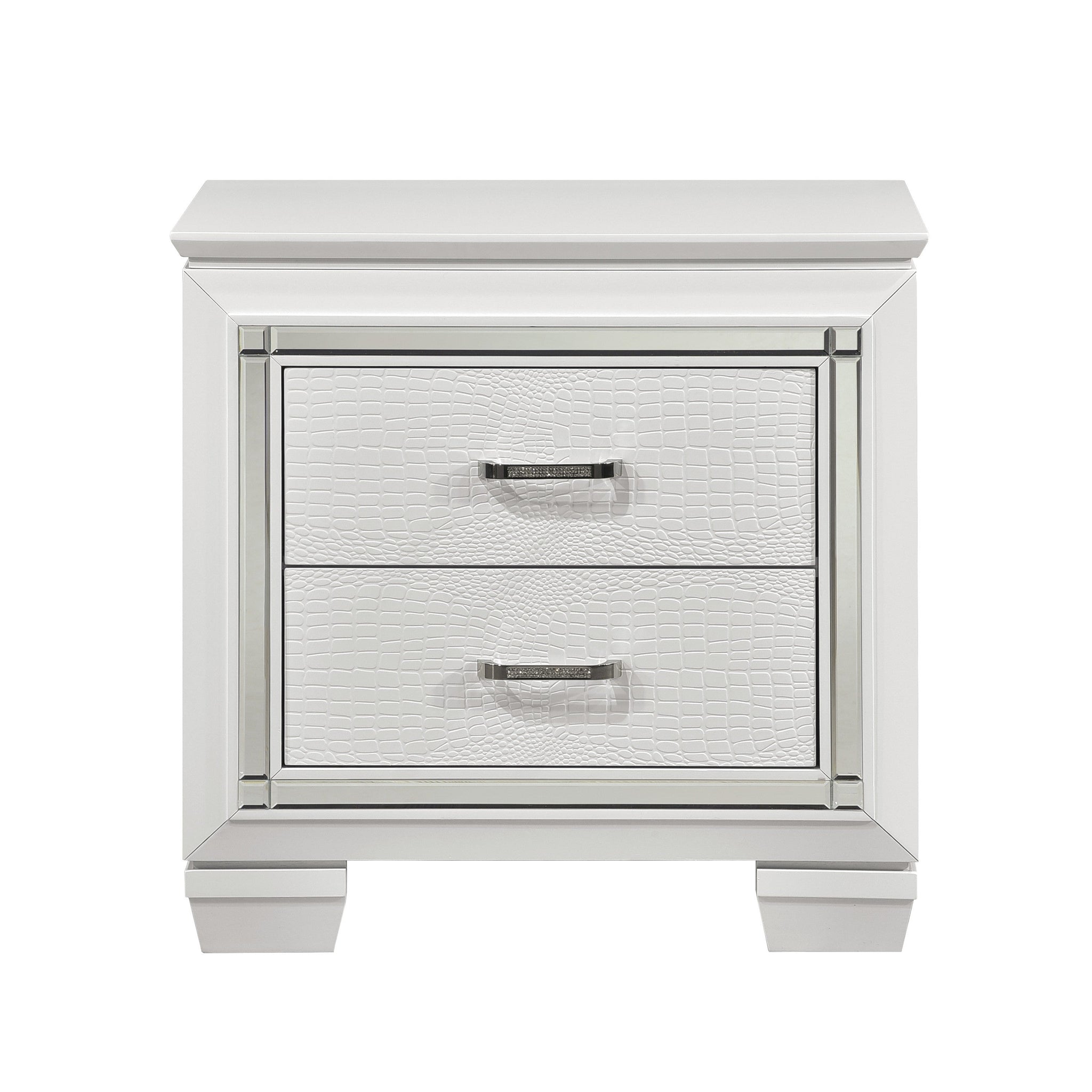 Glamour reigns in the design of the Allura Collection. Framing each piece is a decorative beveled mirror accent that enhances the illumination from the touch-engaged LED backlight of the headboard and mirror, as well as the under-light of the night stand. Alligator embossing and high polished crystal-enhanced hardware boldly accent the finish as does the faux leather crystal-tufted headboard insert of the collection.