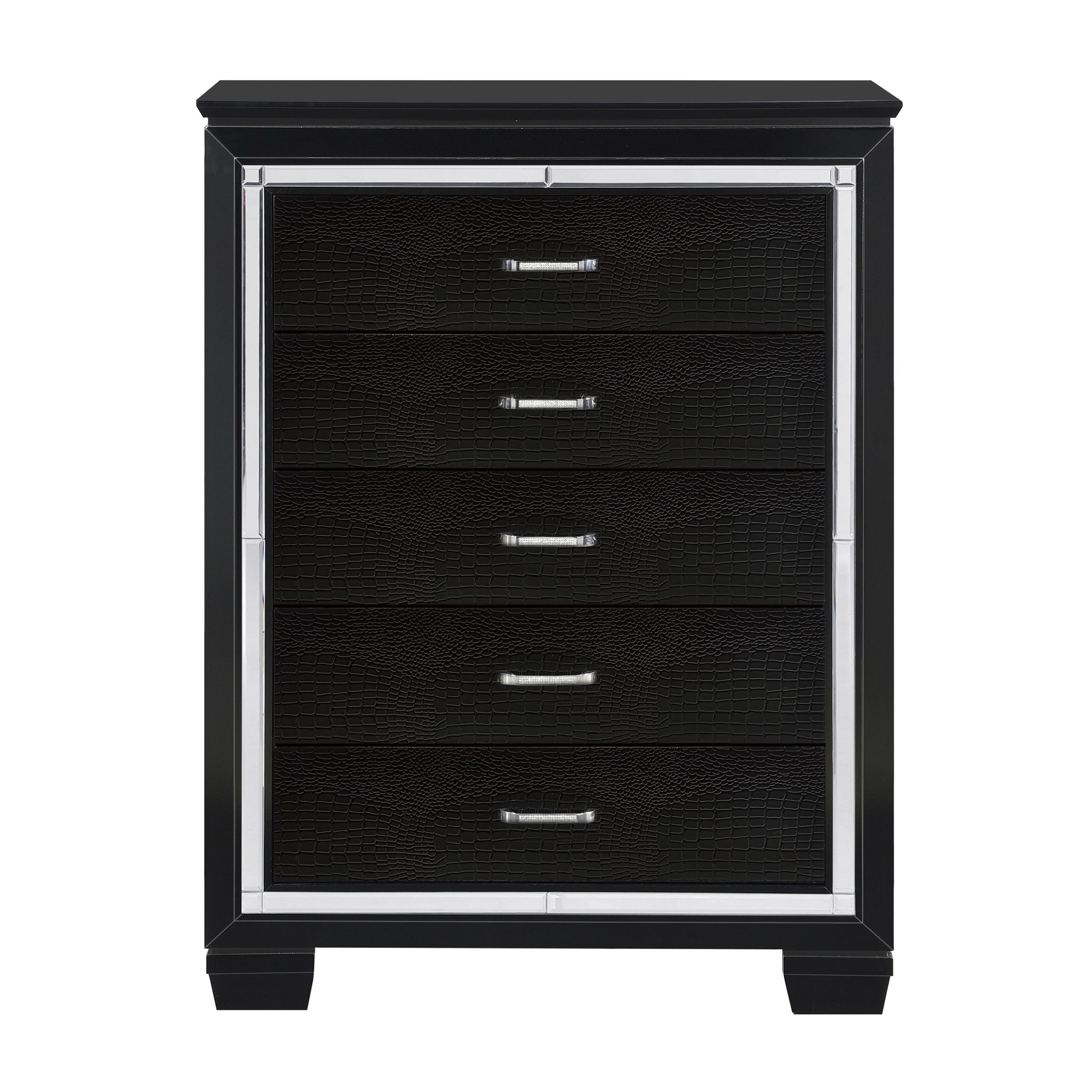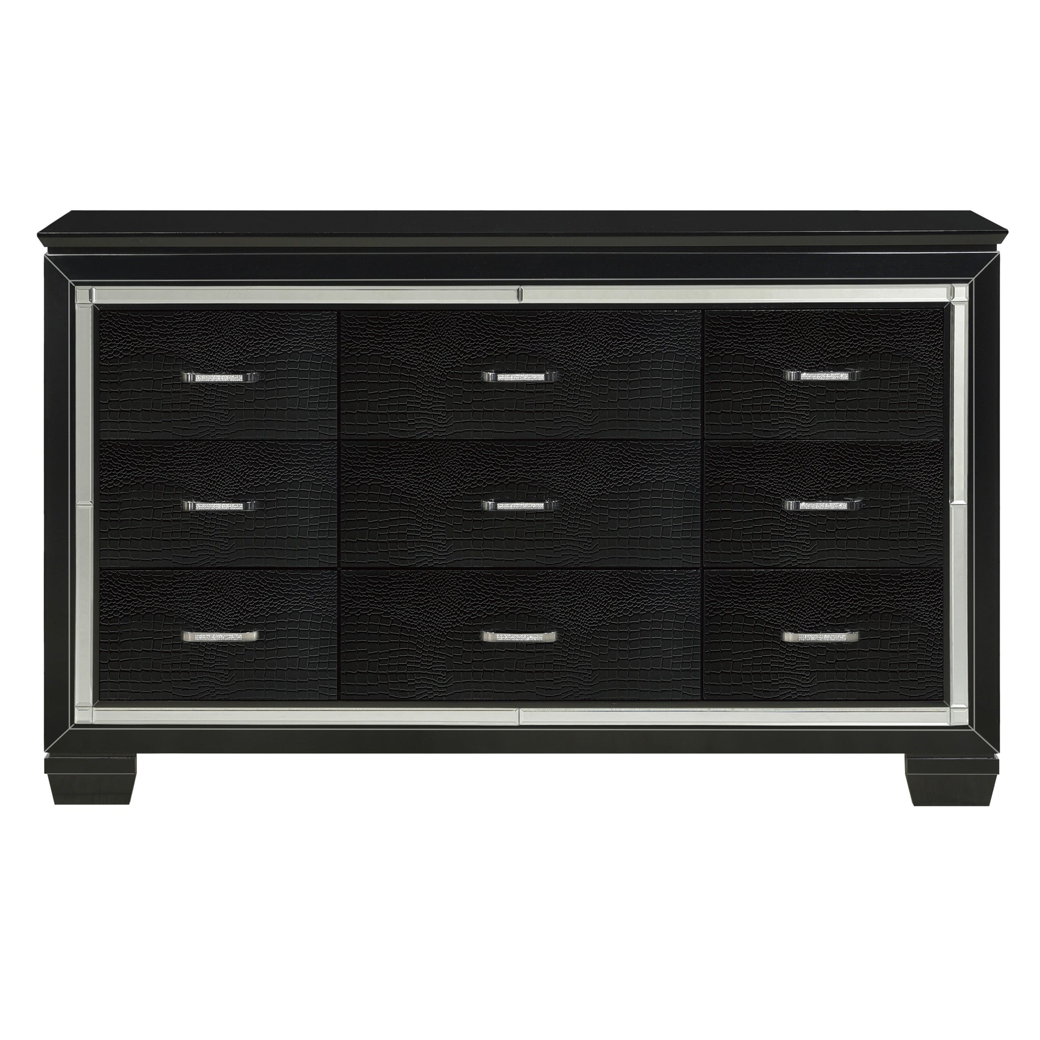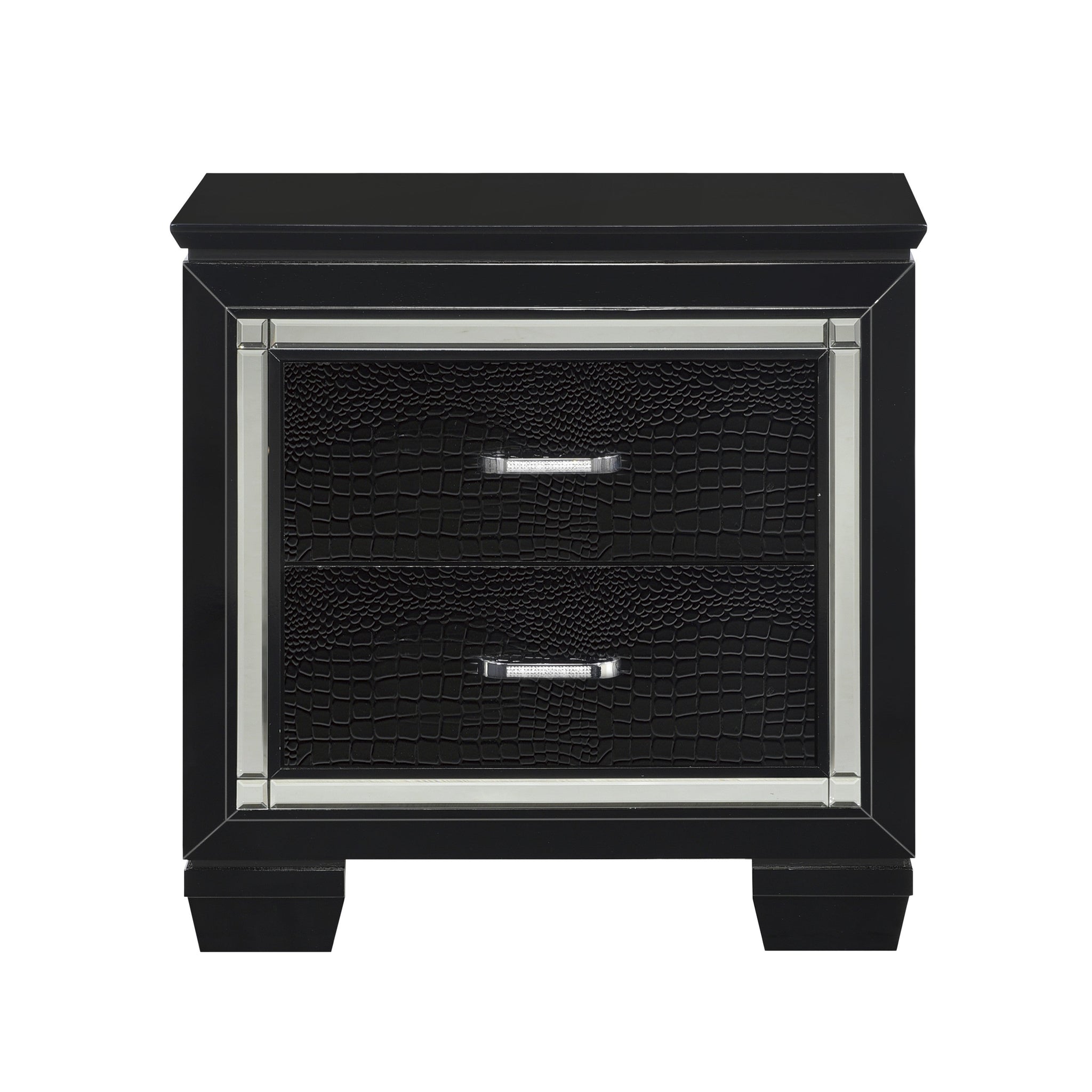 Glamour reigns in the design of the Allura Collection. Framing each piece is a decorative beveled mirror accent that enhances the illumination from the touch-engaged LED backlight of the headboard and mirror, as well as the under-light of the night stand. Alligator embossing and high polished crystal-enhanced hardware boldly accent the finish as does the faux leather crystal-tufted headboard insert of the collection.