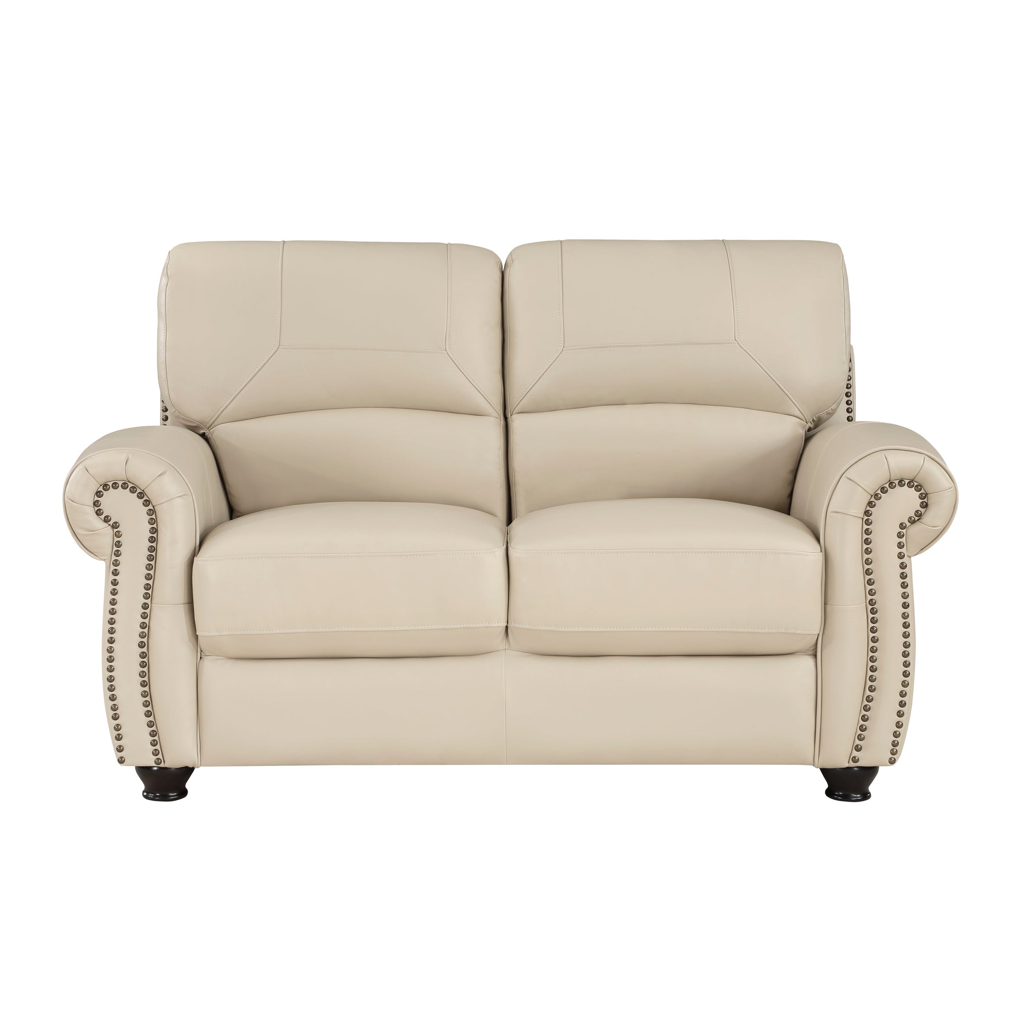 Traditional design and classic accents are paired to create the timeless look of the Foxborough Collection. Cream-hued top-grain leather covers the plush seating of the sofa, love seat, and chair everywhere the hand touches – with faux leather match covering the remaining areas. The profile of the seating arrangement is defined by elegantly rolled arms, plush seatbacks, and nailhead trim.