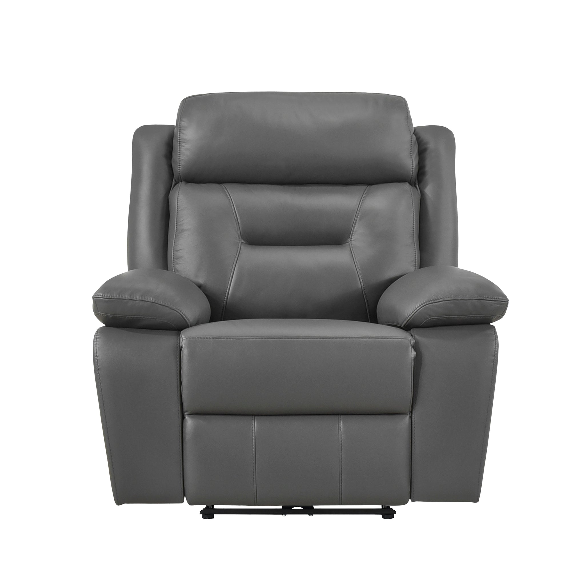 Designed with stylistic versatility and comfort in mind, the Laconia Collection’s addition to your home’s casual living room provides a comfortable gathering spot for your family and friends. The reclining ends of the sofa and love seat, as well as the reclining chair, are engaged with a touch to the side mounted power controls. The transitional frame of the sofa, love seat, and chair is covered in 100 percent top grain leather where the body touches, with faux leather covering the remaining areas, its silver hue complementing your home’s décor.
