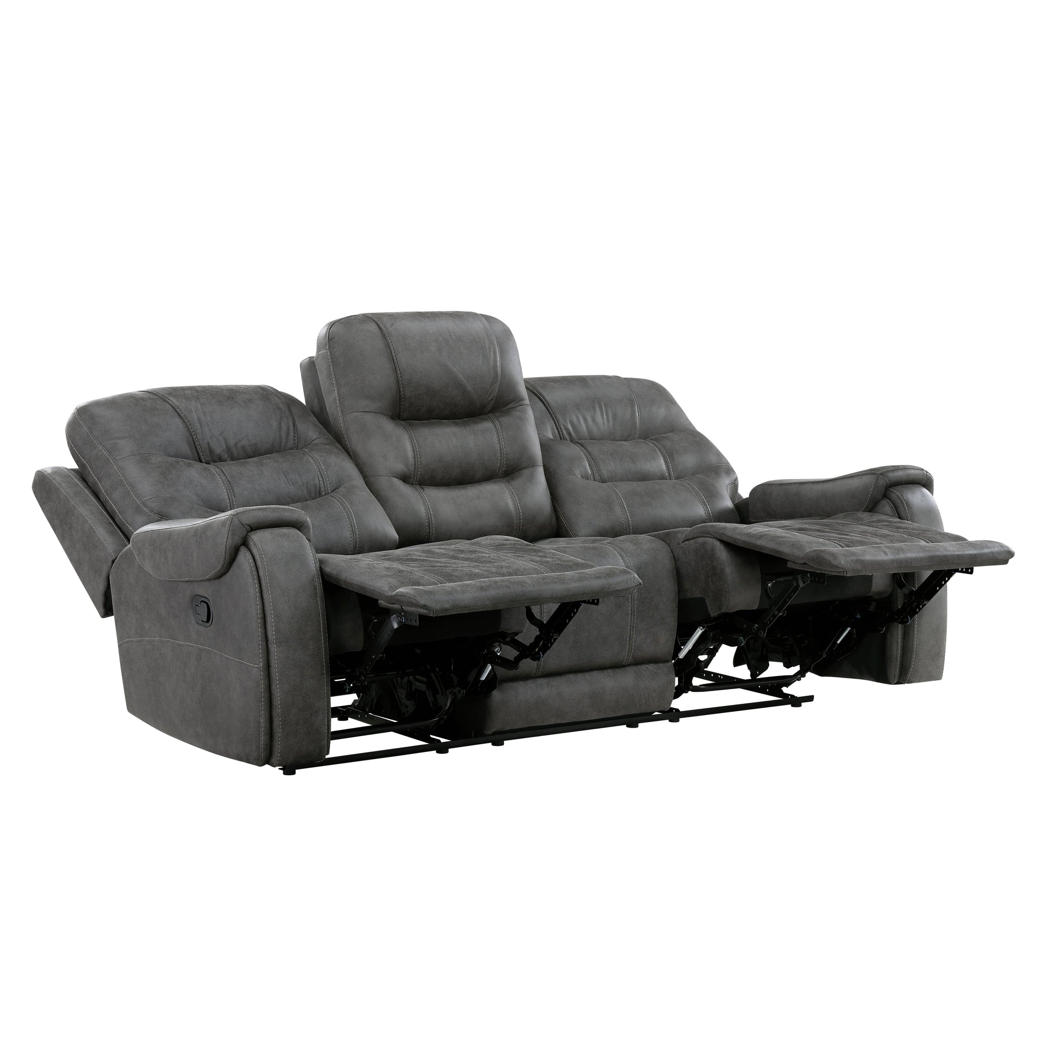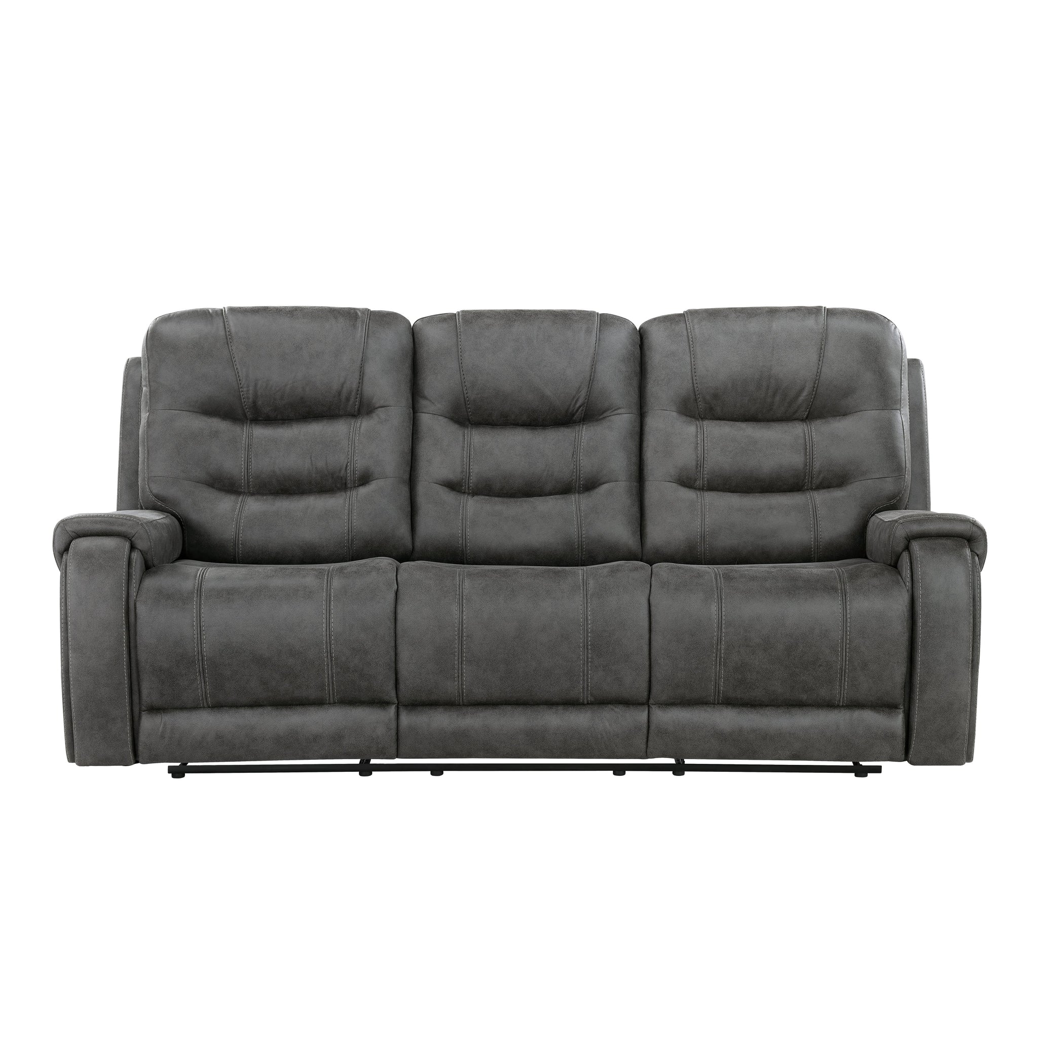 A subtle modern profile is combined with plush seating to create the design of the Oberon Collection. The sofa and love seat feature dual reclining ends with the love seat featuring a console with cup holders and hidden storage space while the reclining chair allows for solo seating within your space. Manual motion mechanisms allow for your reclined experience and are engaged with a pull of the side mounted tab. Dark gray polished microfiber or grayish-brown polished microfiber covers the collection, its neutral hue offering a warm balance to your living room’s décor.