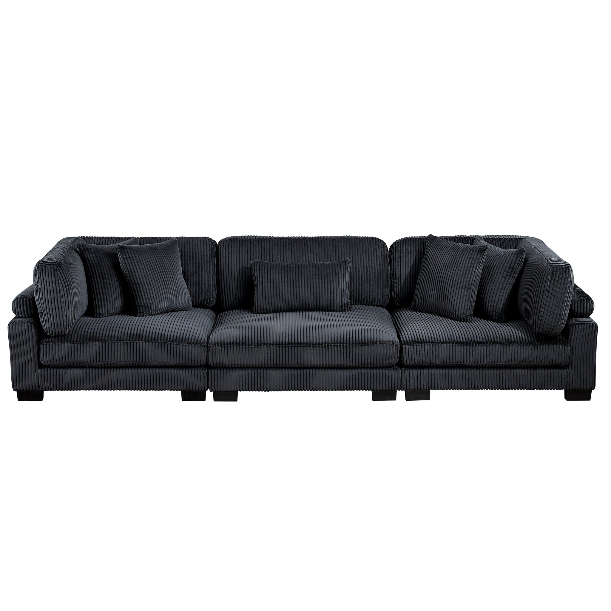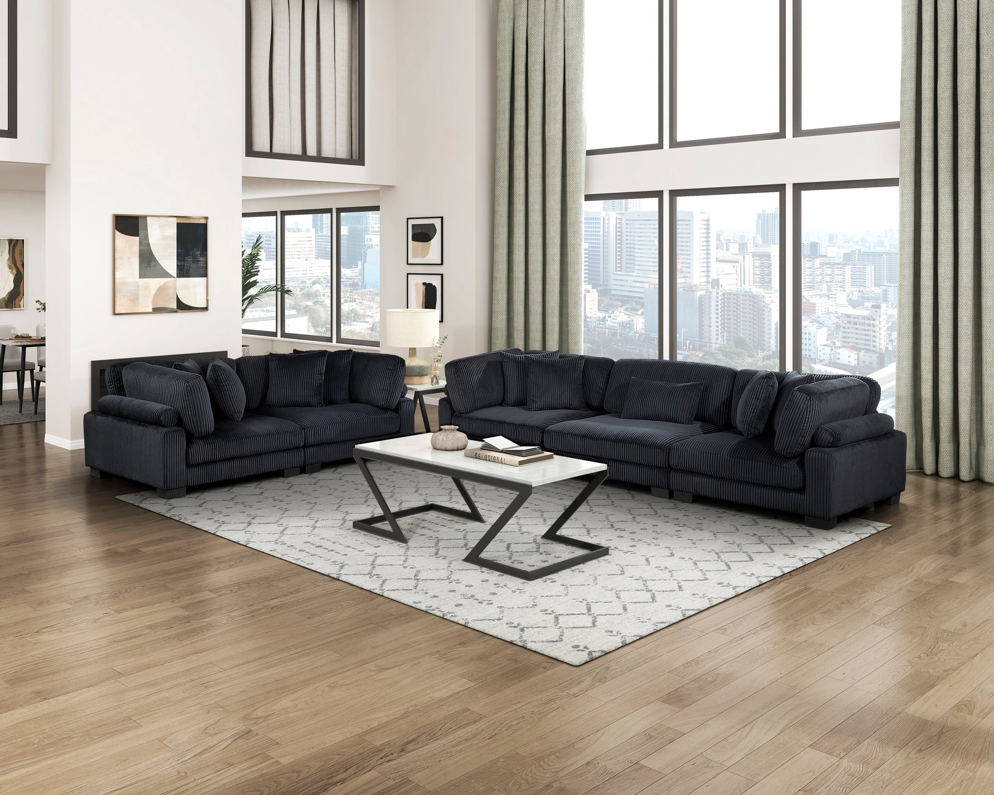 Configurable to your available space, the Traverse Collection allows for the addition and detachment of pieces for a customized seating experience. The available corner unit, armless chair and ottoman can be mixed and matched to fit your needs, creating traditional configurations from a sofa or love seat to an imaginative sectional creation. The plush black corduroy fabric upholstery creates a plush expanse for a soft touch experience. The corner seat features two toss pillows, adjustable back and arm rest, and reversible cushions. The armless chair features a lumbar pillow, and reversible cushions. The versatility in placement of the ottoman is left to your creative vision, using it as a stand-alone unit or part of a larger configuration.
