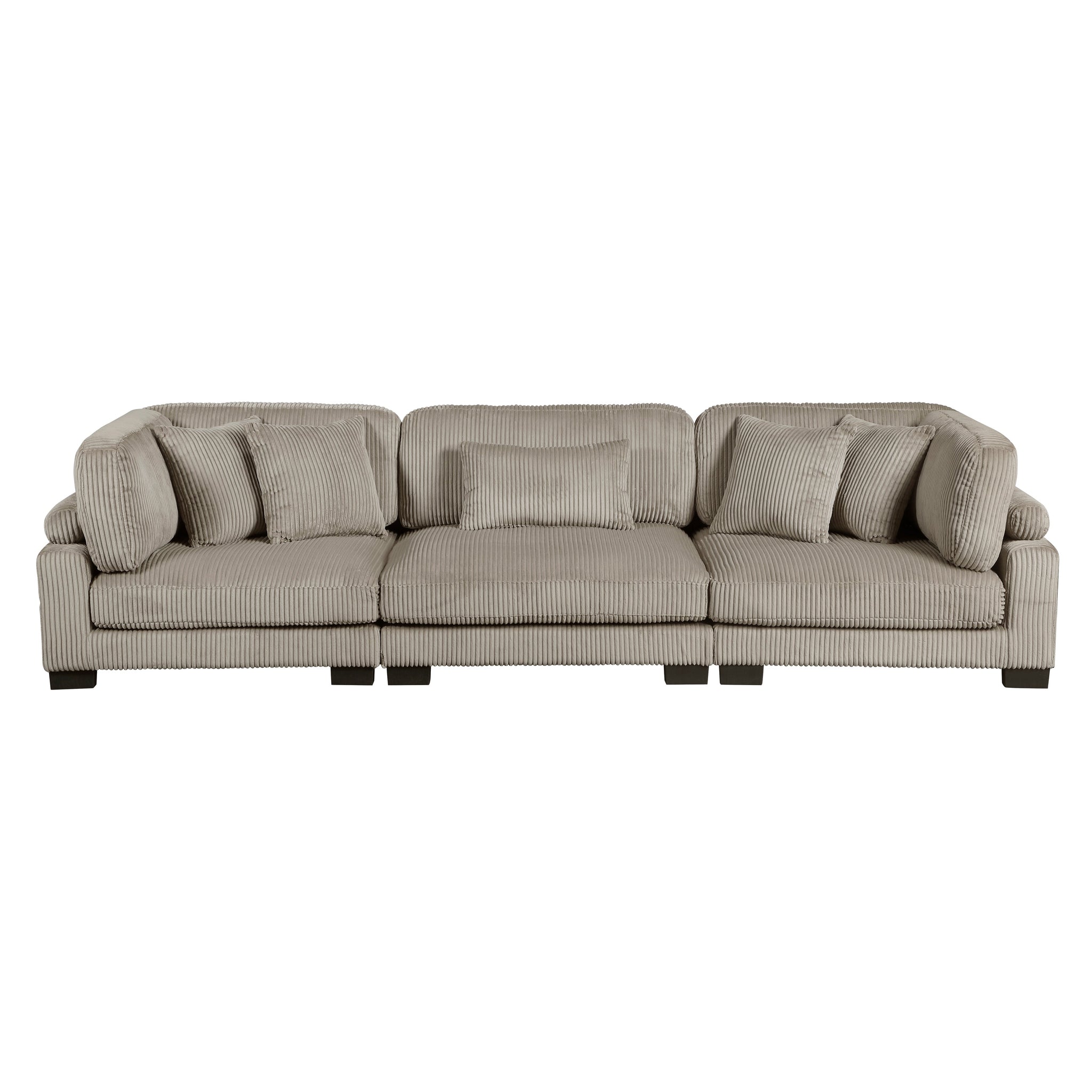 Configurable to your available space, the Traverse Collection allows for the addition and detachment of pieces for a customized seating experience. The available corner unit, armless chair and ottoman can be mixed and matched to fit your needs, creating traditional configurations from a sofa or love seat to an imaginative sectional creation. The plush gold brown corduroy fabric upholstery creates a plush expanse for a soft touch experience. The corner seat features two toss pillows, adjustable back and arm rest, and reversible cushions. The armless chair features a lumbar pillow, and reversible cushions. The versatility in placement of the ottoman is left to your creative vision, using it as a stand-alone unit or part of a larger configuration.
