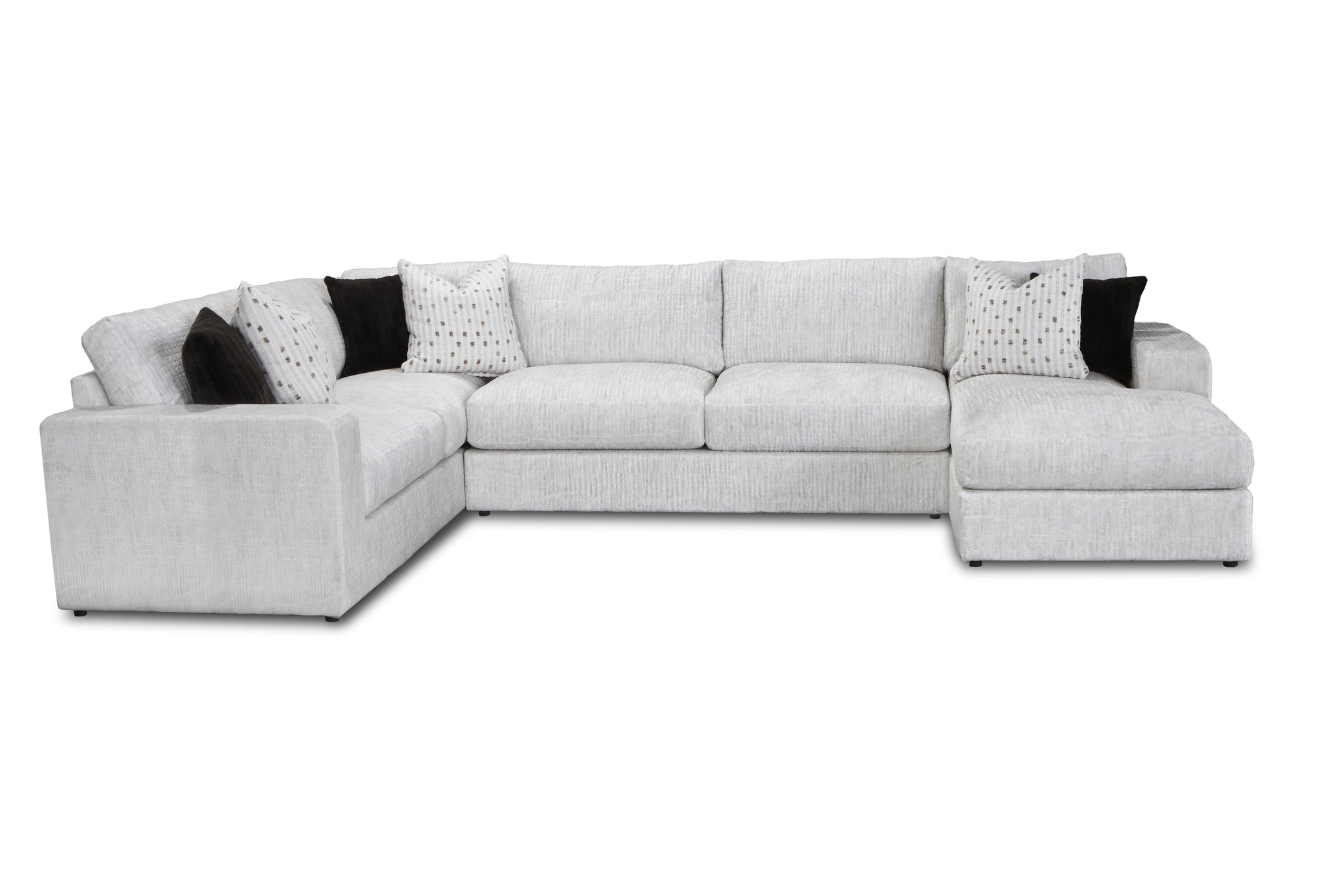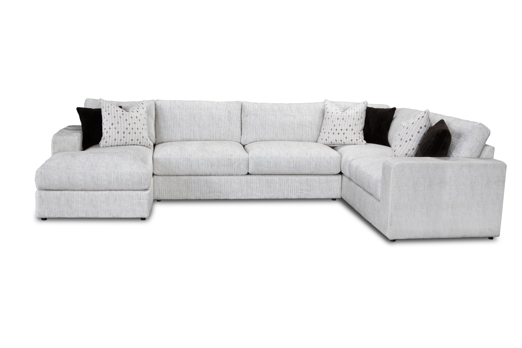 Transform your living room into a hub of comfort and style with our spacious U-shaped sectional. Upholstered in a soft, textured beige microfiber, this sectional is designed for family-friendly living with its durable solid wood and plywood frame. The plush, high-density foam cushions offer a supportive seating experience, while reversible cushions and removable, zippered covers make maintenance simple. This 3-piece sectional, which includes a chaise lounge, provides ample seating for everyone and comes complete with six stylish décor pillows.